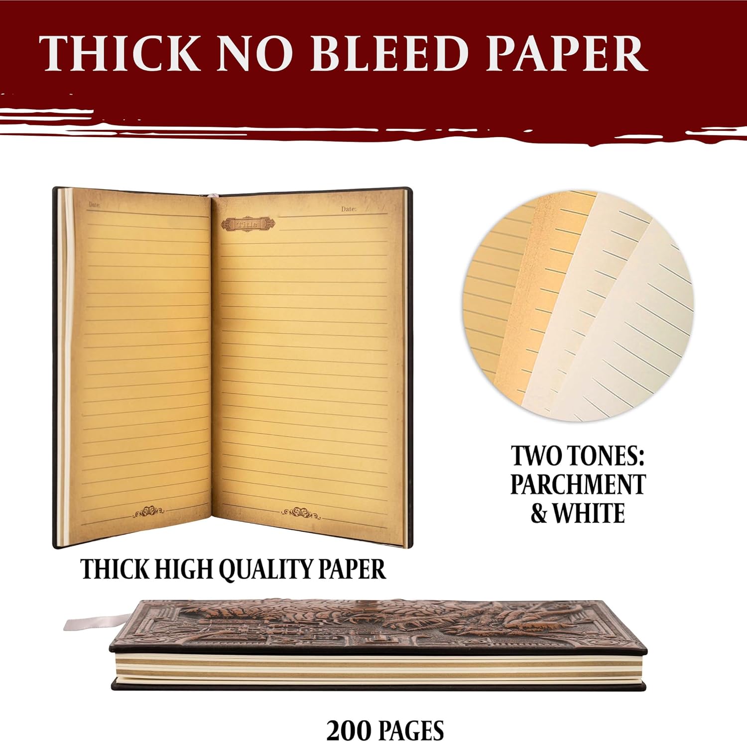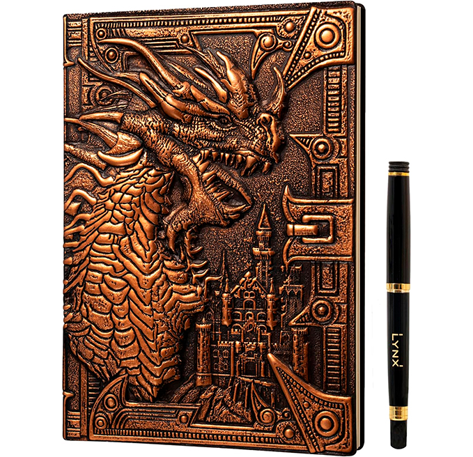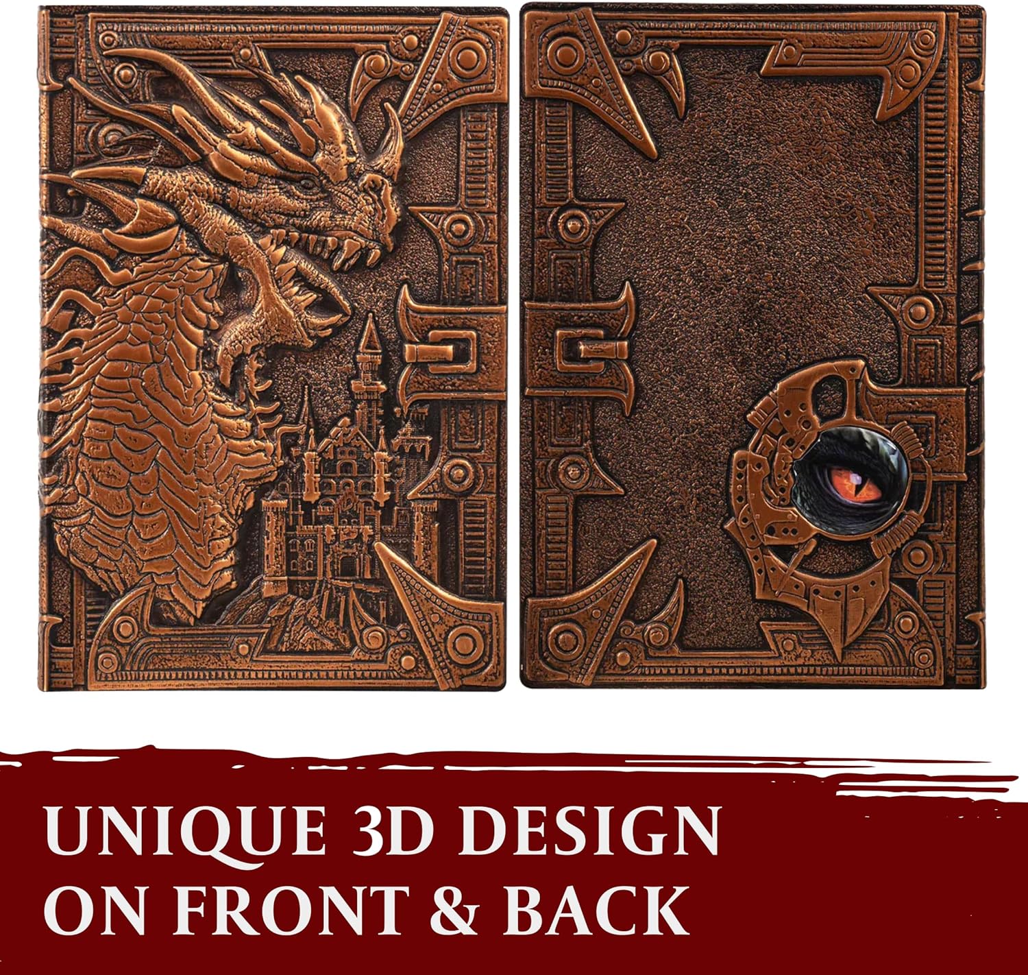 Regala un cuaderno de notas único y personalizado con nuestro cuaderno A5 de 200 páginas con tapa de cuero sintético repujado con un dragón de bronce 3D. Este cuaderno es perfecto para apasionados de los juegos de rol, estudiantes, profesionales y cualquier persona que busque un cuaderno de notas de alta calidad y con un diseño exclusivo.
