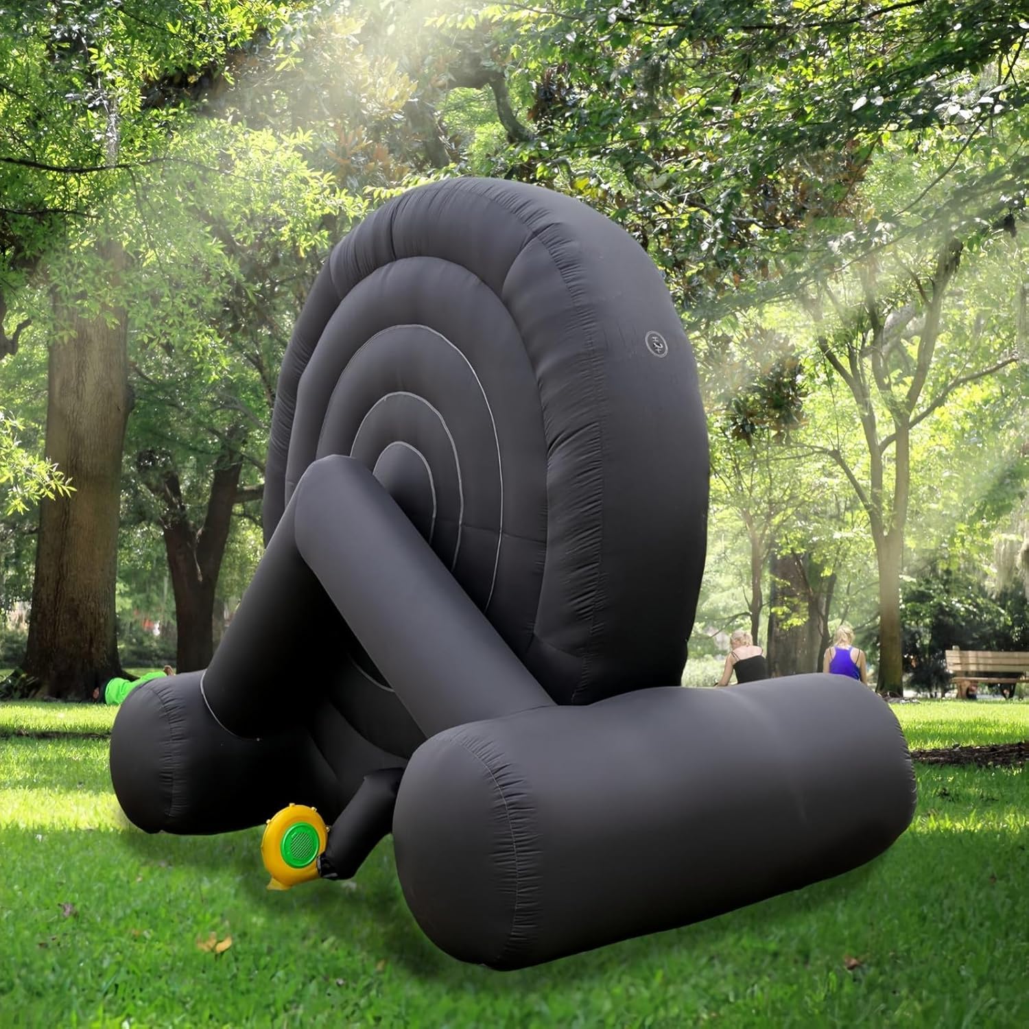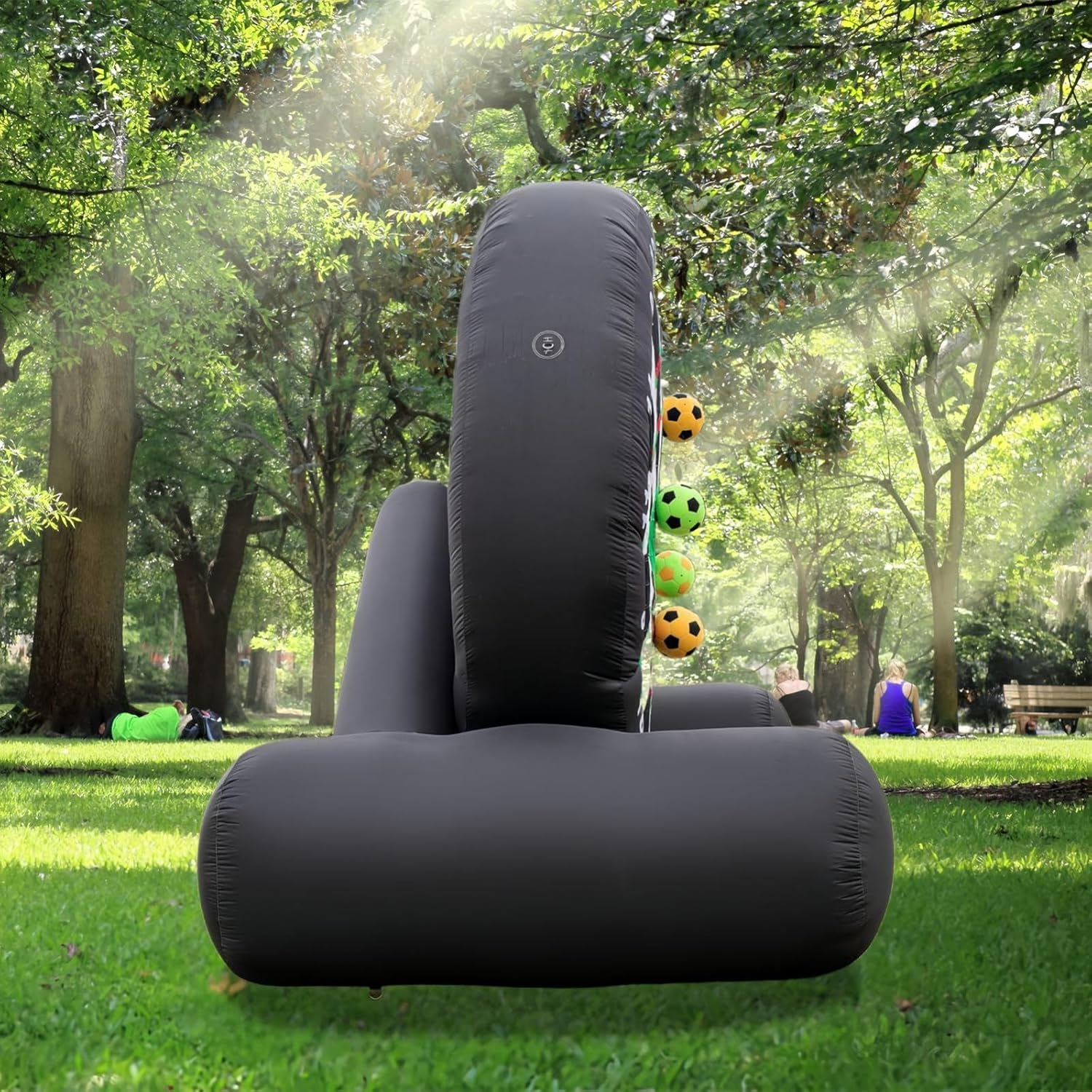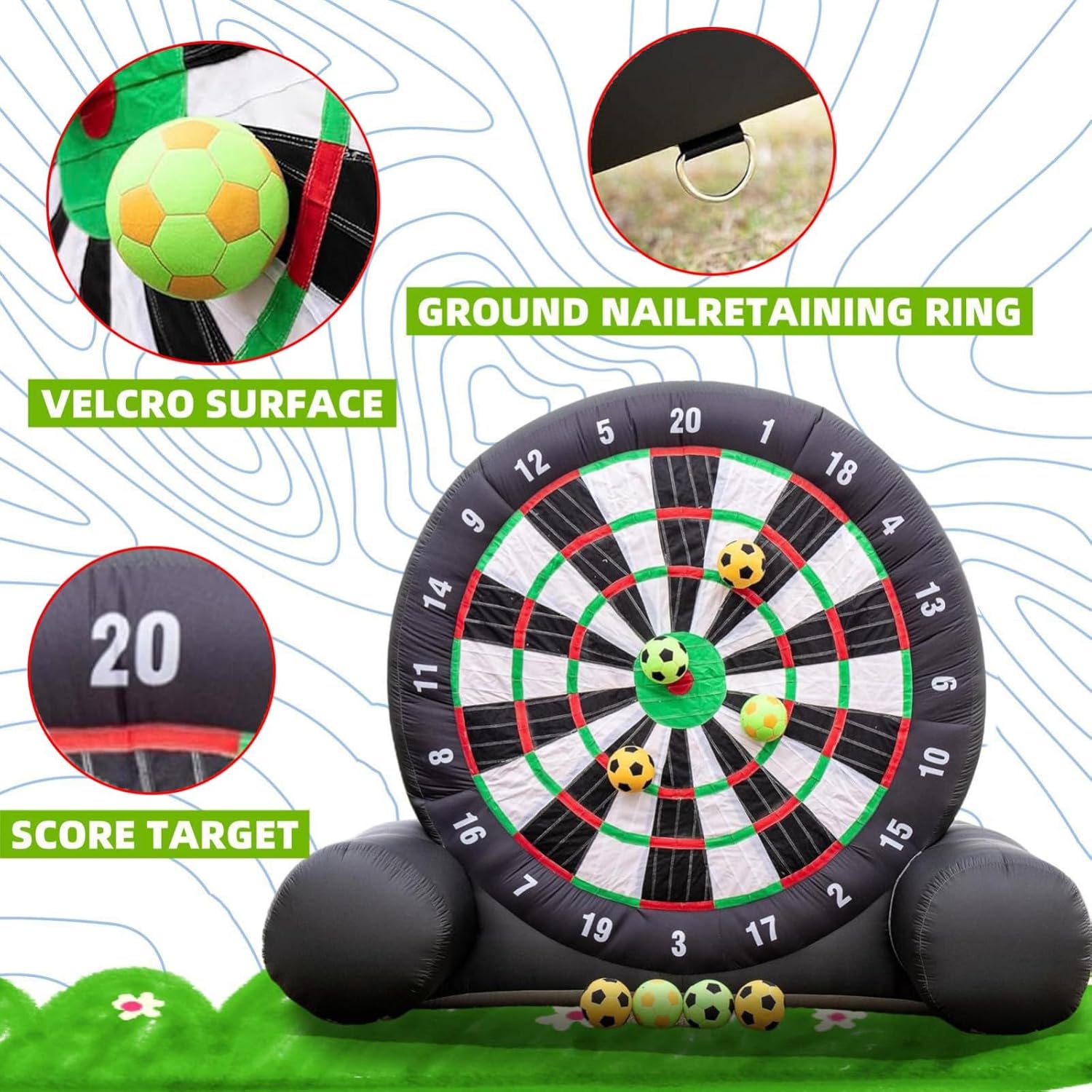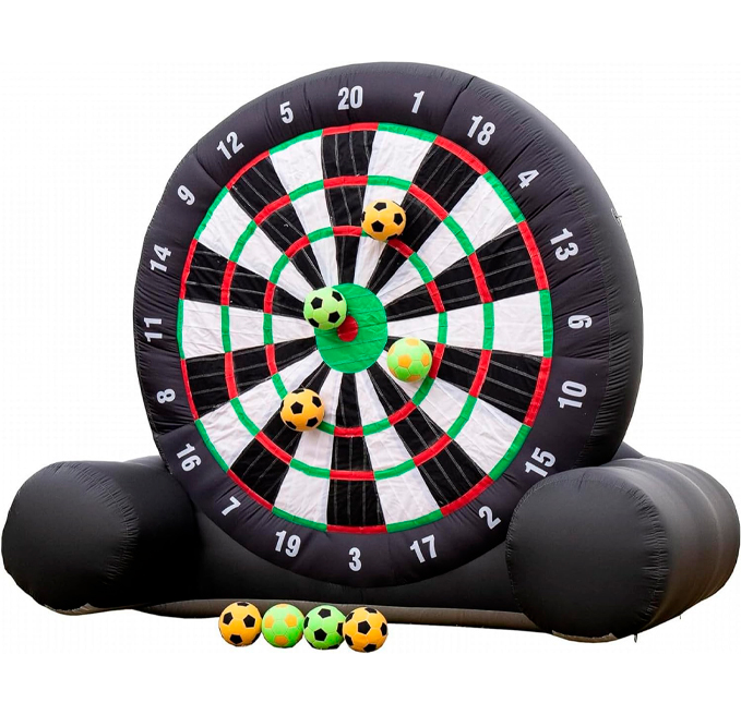 Diana inflable gigante para dardos fútbol, fabricada en tela resistente con velcro adhesivo, incluye soplador y 8 pelotas. Ideal para eventos al aire libre.