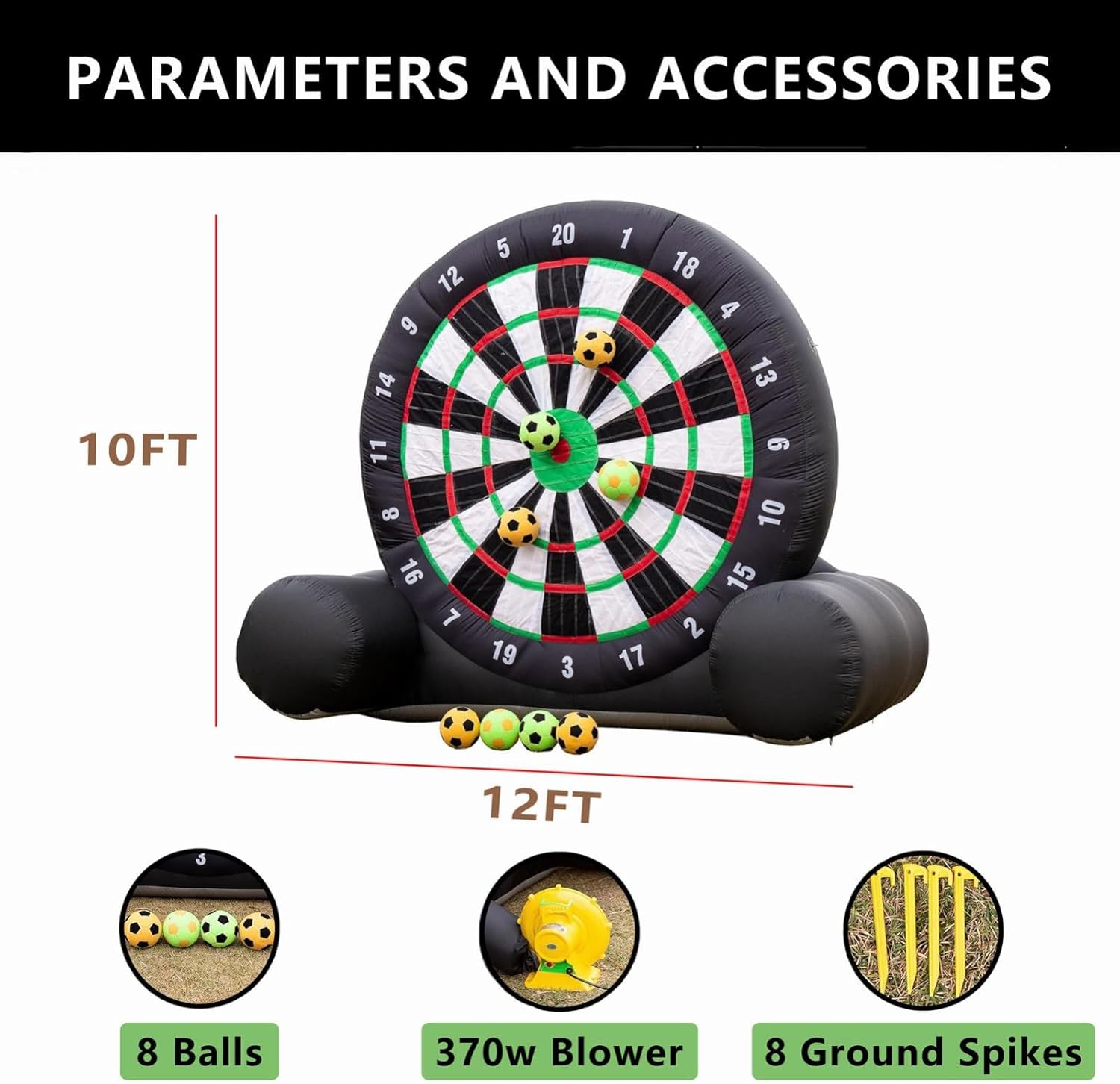 Disfruta del deporte más innovador y emocionante con la Diana Gigante Inflable para Dardos Fútbol. Con un imponente tamaño de 12 pies de ancho y 10 pies de alto, este juego combina la emoción del fútbol con la precisión de los dardos. Fabricada con tela Oxford 210D resistente, es antiestática, duradera y cuenta con costuras reforzadas para una mayor durabilidad. Su diseño de marco triangular ofrece una excelente estabilidad, permitiendo que tanto niños como adultos se diviertan durante horas. El tablero de dardos, recubierto de velcro súper adhesivo, asegura que las pelotas se adhieran firmemente, proporcionando una experiencia de juego fluida y emocionante. Este set incluye un potente soplador de 370W que infla la diana en cuestión de minutos, así como 8 pelotas de fútbol diseñadas para ofrecer el máximo rendimiento en cada tiro. Ideal para eventos corporativos, fiestas al aire libre, días de playa y más, esta diana es fácil de instalar y almacenar, haciendo que la diversión esté siempre al alcance.