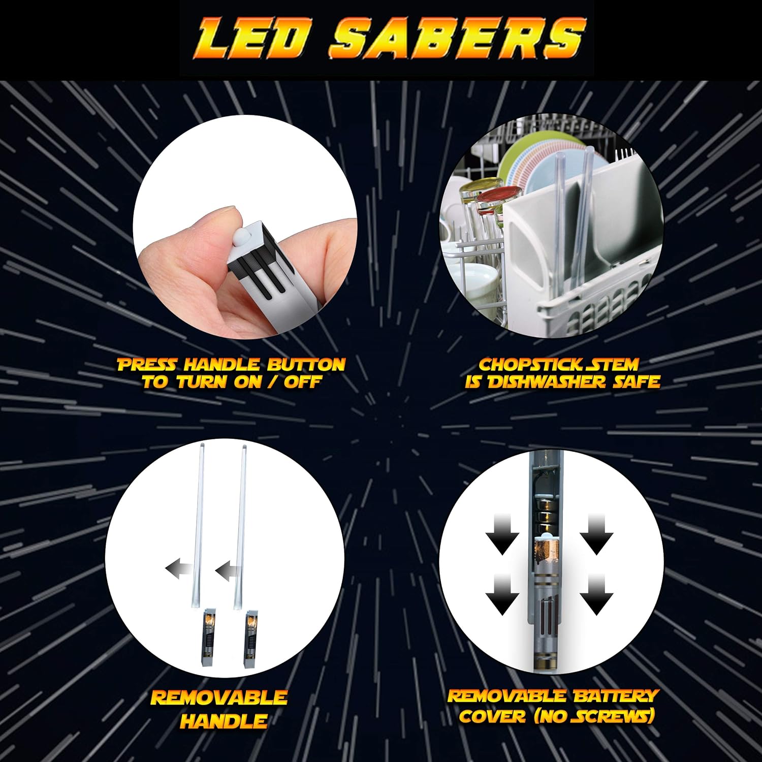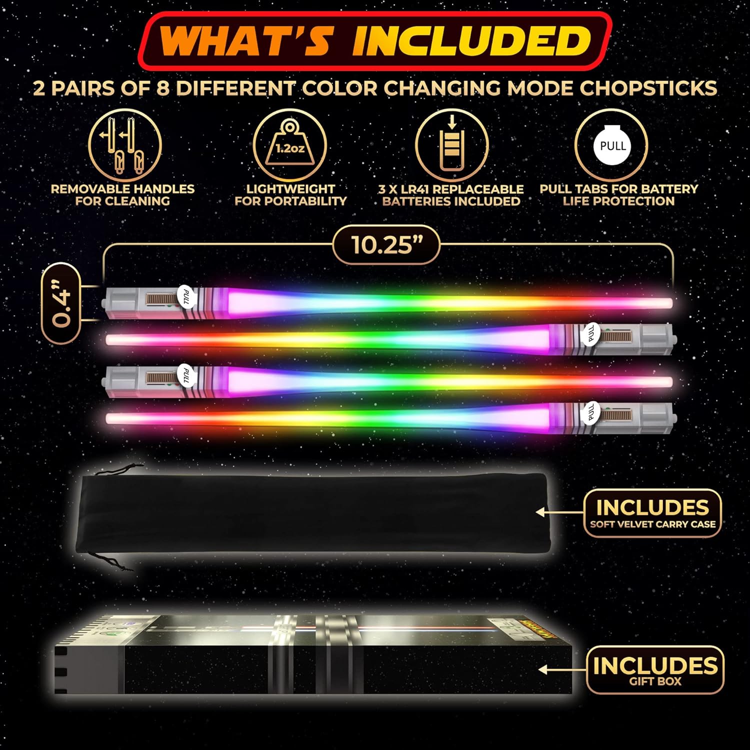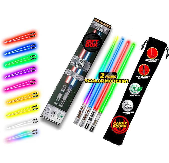 Diseño inspirado en Star Wars: Transforma cada comida en una aventura espacial con estos palillos que emiten luz LED en colores brillantes, ideales para fanáticos de la saga.