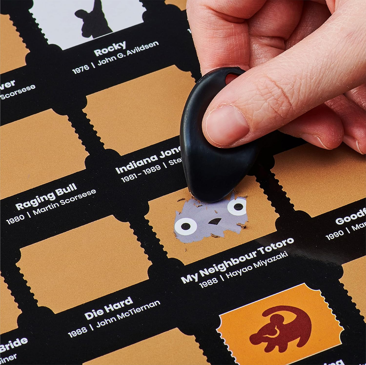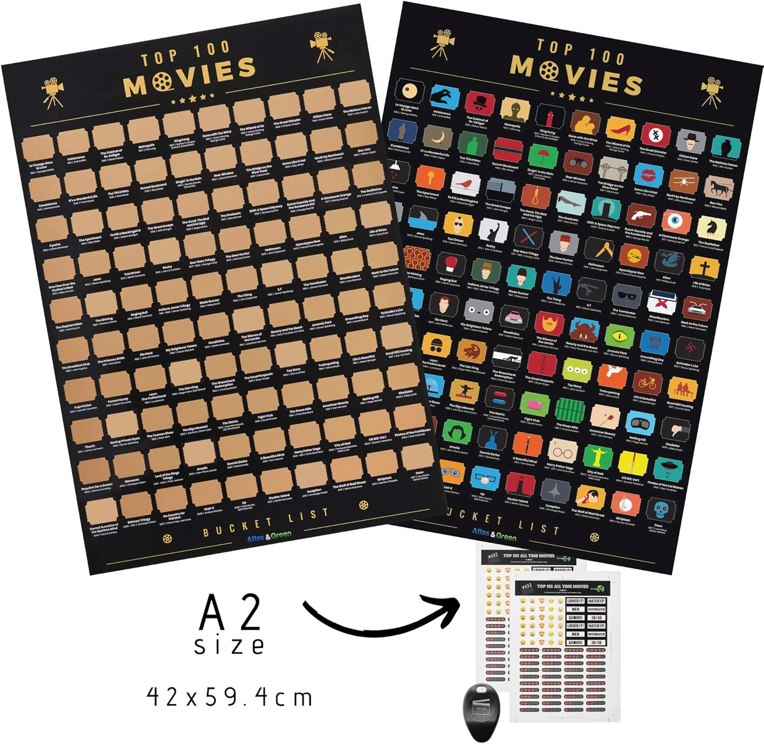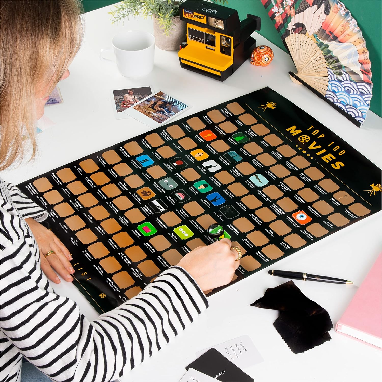Descubre y explora las mejores películas de todos los tiempos con nuestro póster de 100 películas para rascar. Rasca cada película que hayas visto para revelar una representación pictográfica única y divertida. El póster incluye 2 hojas de calcomanías para calificar cada película, así como un tubo de regalo y un selector de rasguño.