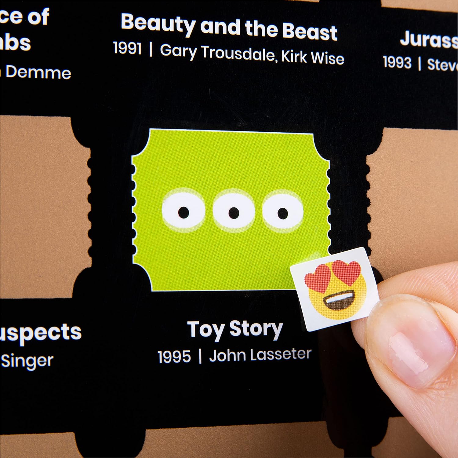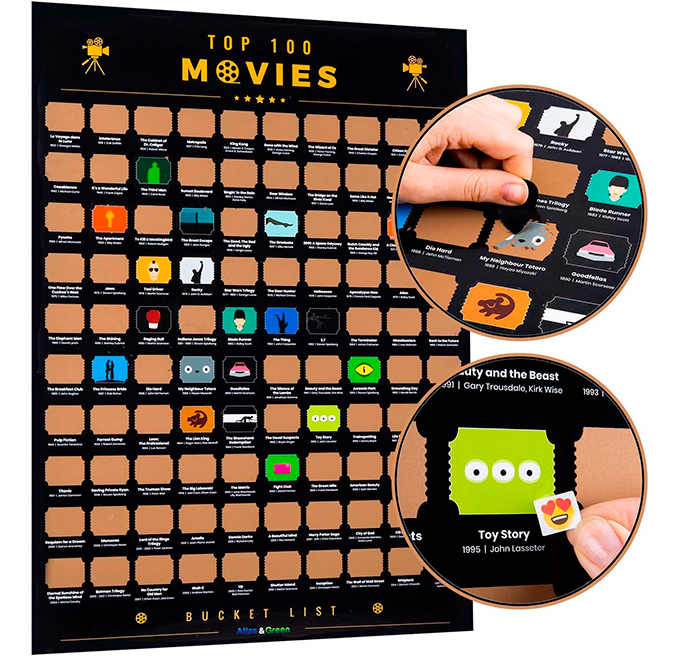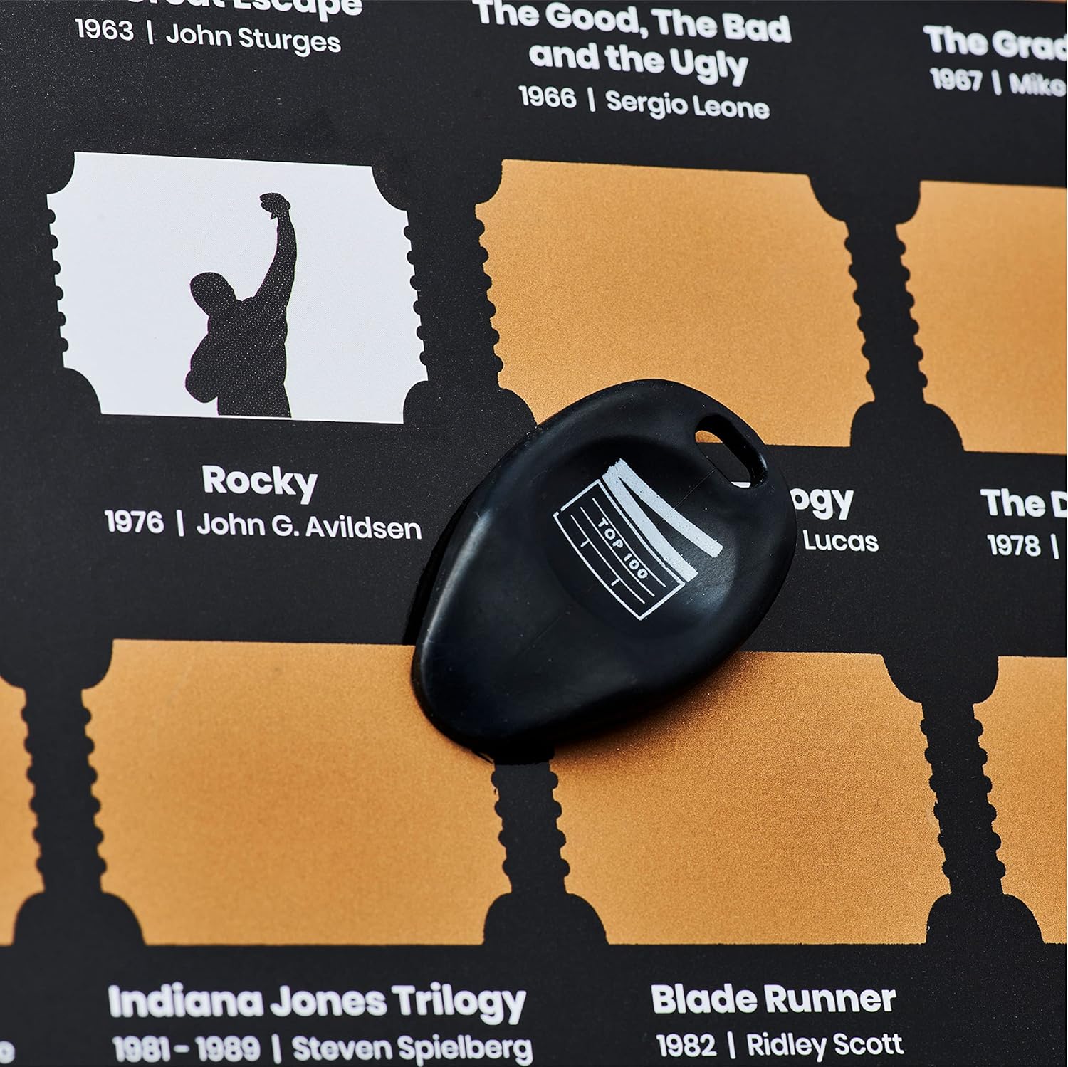 Descubre y explora las mejores películas de todos los tiempos con nuestro póster de 100 películas para rascar. Rasca cada película que hayas visto para revelar una representación pictográfica única y divertida. El póster incluye 2 hojas de calcomanías para calificar cada película, así como un tubo de regalo y un selector de rasguño.