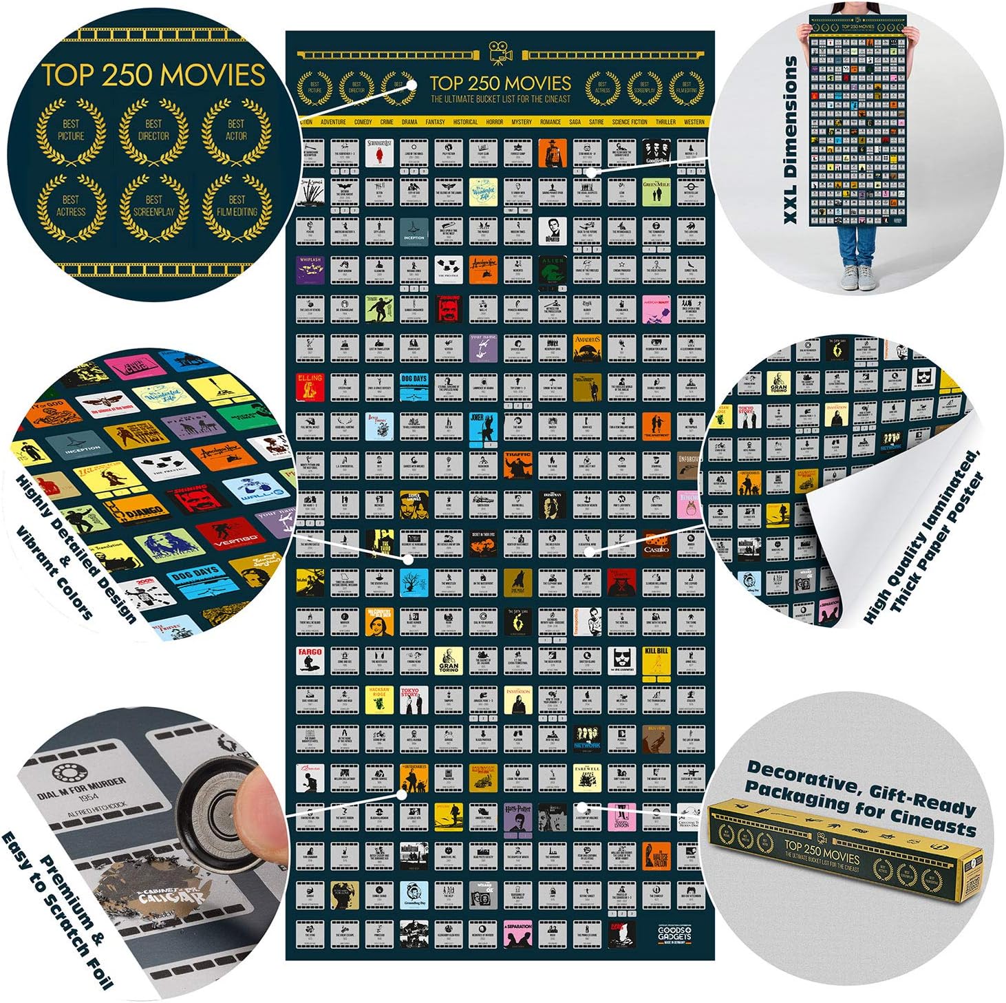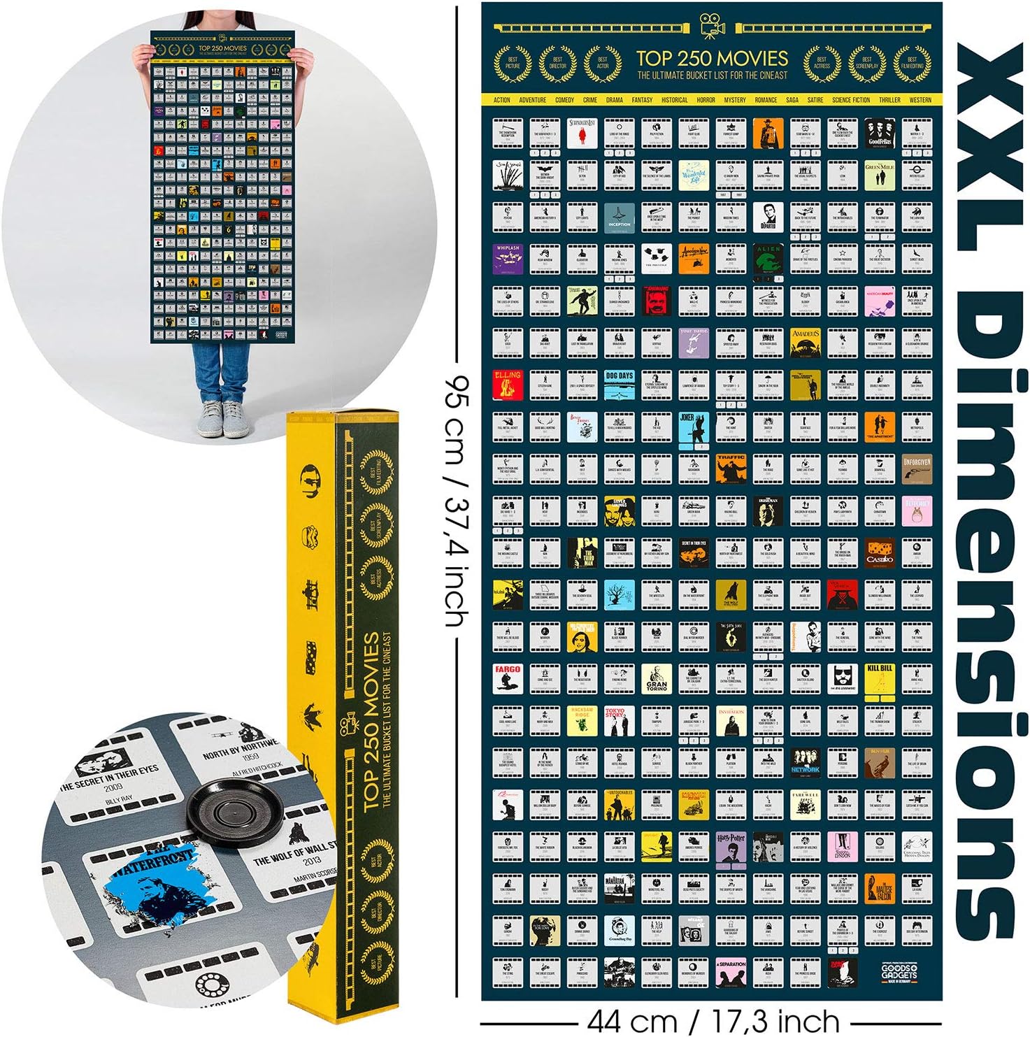 Descubre el póster de películas más completo y divertido. Con un tamaño XXL de 100 x 45 cm, este póster de rascar te permitirá explorar las 250 mejores películas de todos los tiempos. Diseñado con atención al detalle, este póster es una decoración maravillosa y atmosférica para cualquier sala de estar, sala de hobby o sala de cine privada.