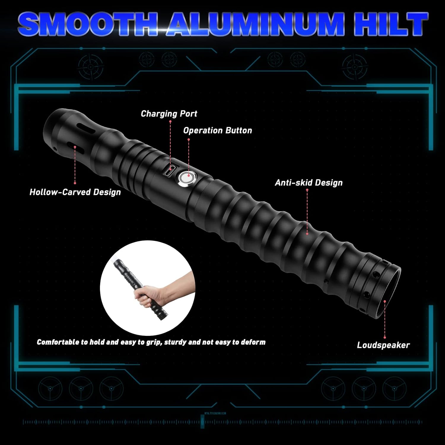 El mango del sable está hecho de aluminio metálico y está muy bien pulido, lo que le da un buen peso sólido y un diseño antideslizante que hace que sea cómodo de agarrar. La hoja de PC es duradera y resistente a los golpes, no es fácil de doblar o doblar, y soporta duelos pesados reales.