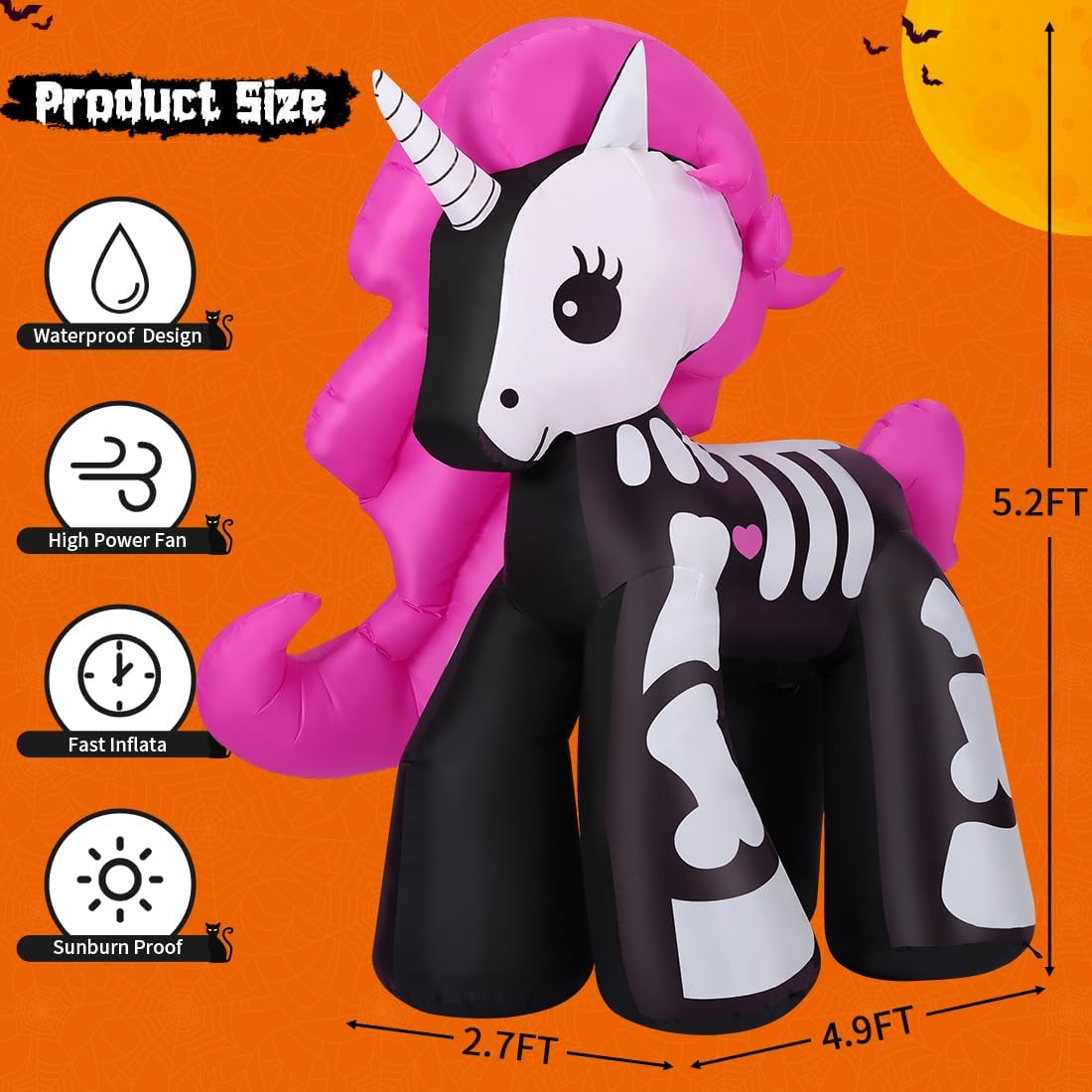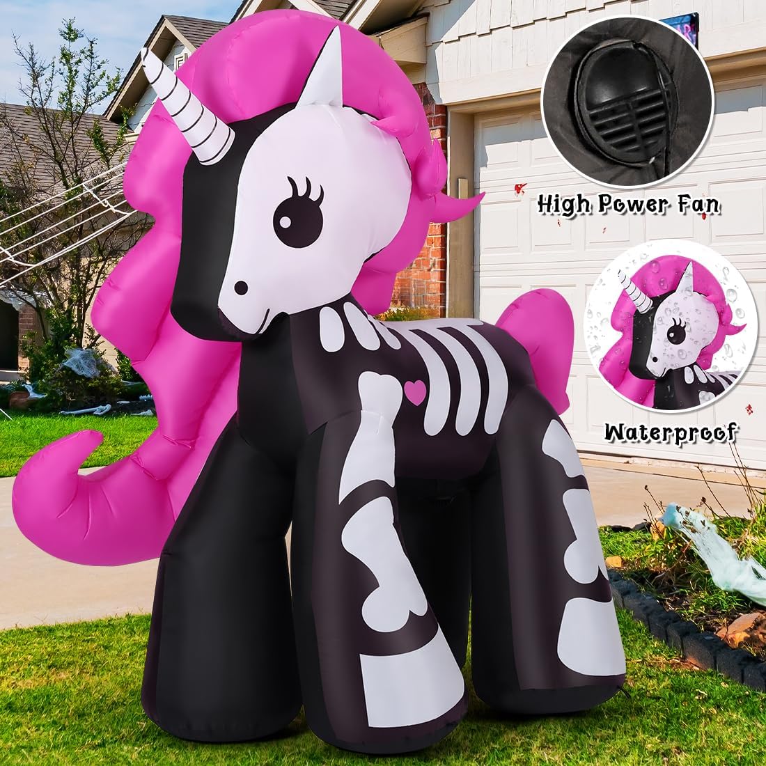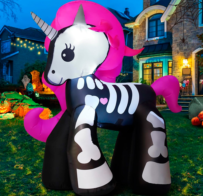 Unicornio inflable de Halloween de unos 157cm con luces LED integradas. Resistente, fácil de instalar y perfecto para destacar tu decoración exterior.