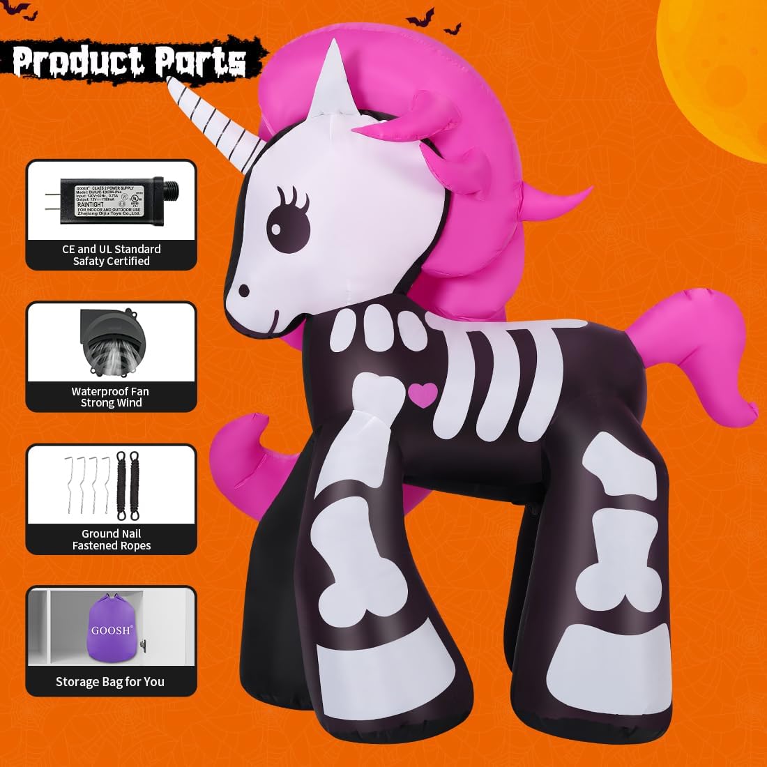Añade un toque encantador y espeluznante a tu decoración de Halloween con este Unicornio Inflable de unos 157cm de GOOSH. Con un divertido diseño de esqueleto y su melena rosa, este unicornio es perfecto para atraer la atención de los más pequeños y sorprender a los visitantes. Las luces LED integradas iluminan su cuerpo, creando un ambiente mágico y destacando tu hogar en la noche de Halloween. Fabricado con poliéster impermeable de alta calidad, es resistente al clima y se infla rápidamente gracias a su potente ventilador. Incluye todo lo necesario para su instalación y fácil almacenamiento: estacas, cuerdas de seguridad, bolsa de arena y una bolsa de almacenamiento. Dale vida a tu jardín o fiesta de Halloween y disfruta de un producto seguro y certificado por CE y UL.
